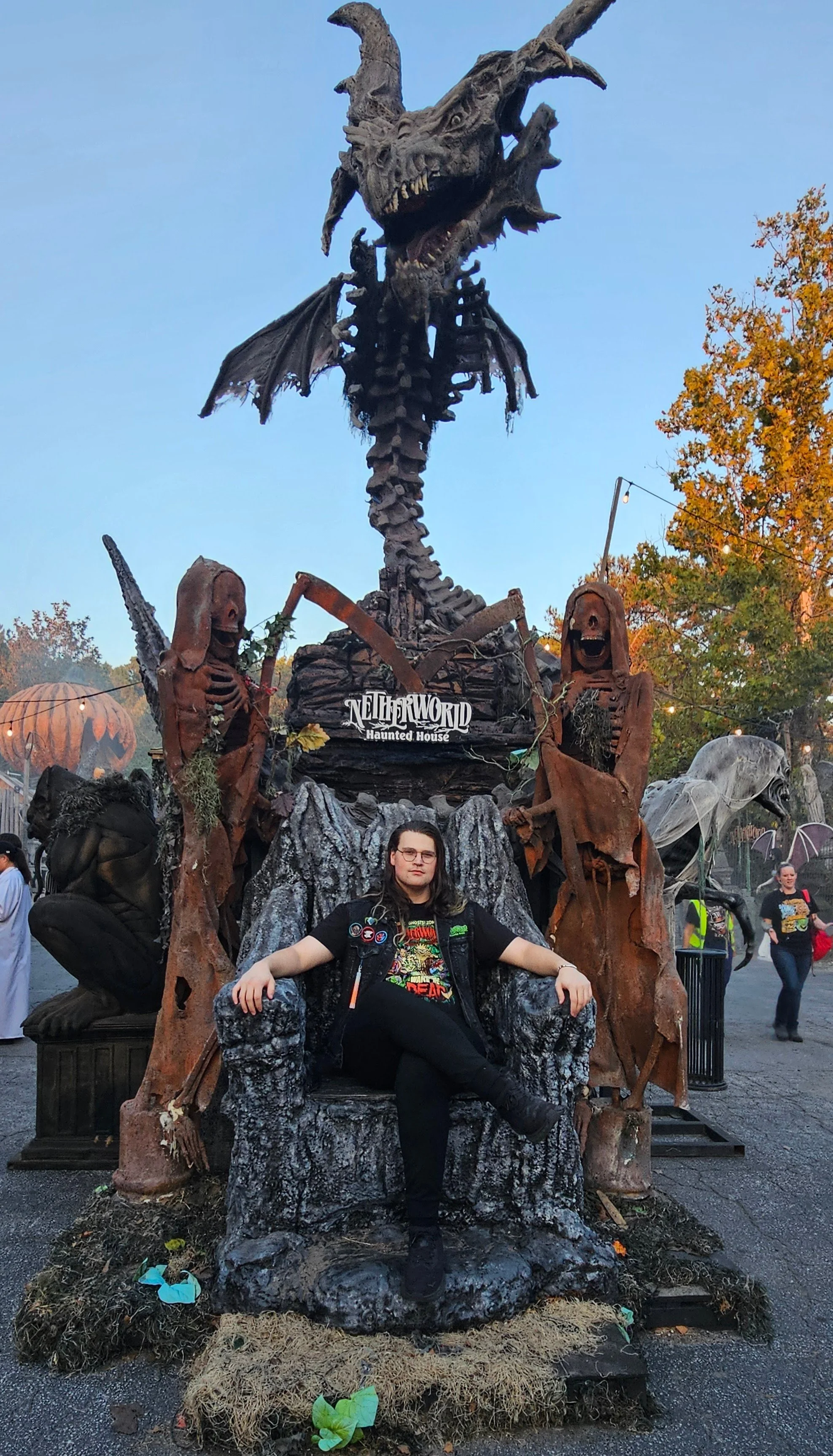I am a scenic artist and costumer currently working in the haunt industry. I have been working in the haunt industry since 2022 where I started as a dresser at Netherworld Haunted House. Since I have been working from Netherworld, I have since been promoted to the ‘midway’ manager, put in charge of the outdoor area between haunted houses where food and souvenirs can be purchased and costumed actors roam. In addition I work in their ‘creature shop’ during the off season preparing costumes and props for the new seasons each year.