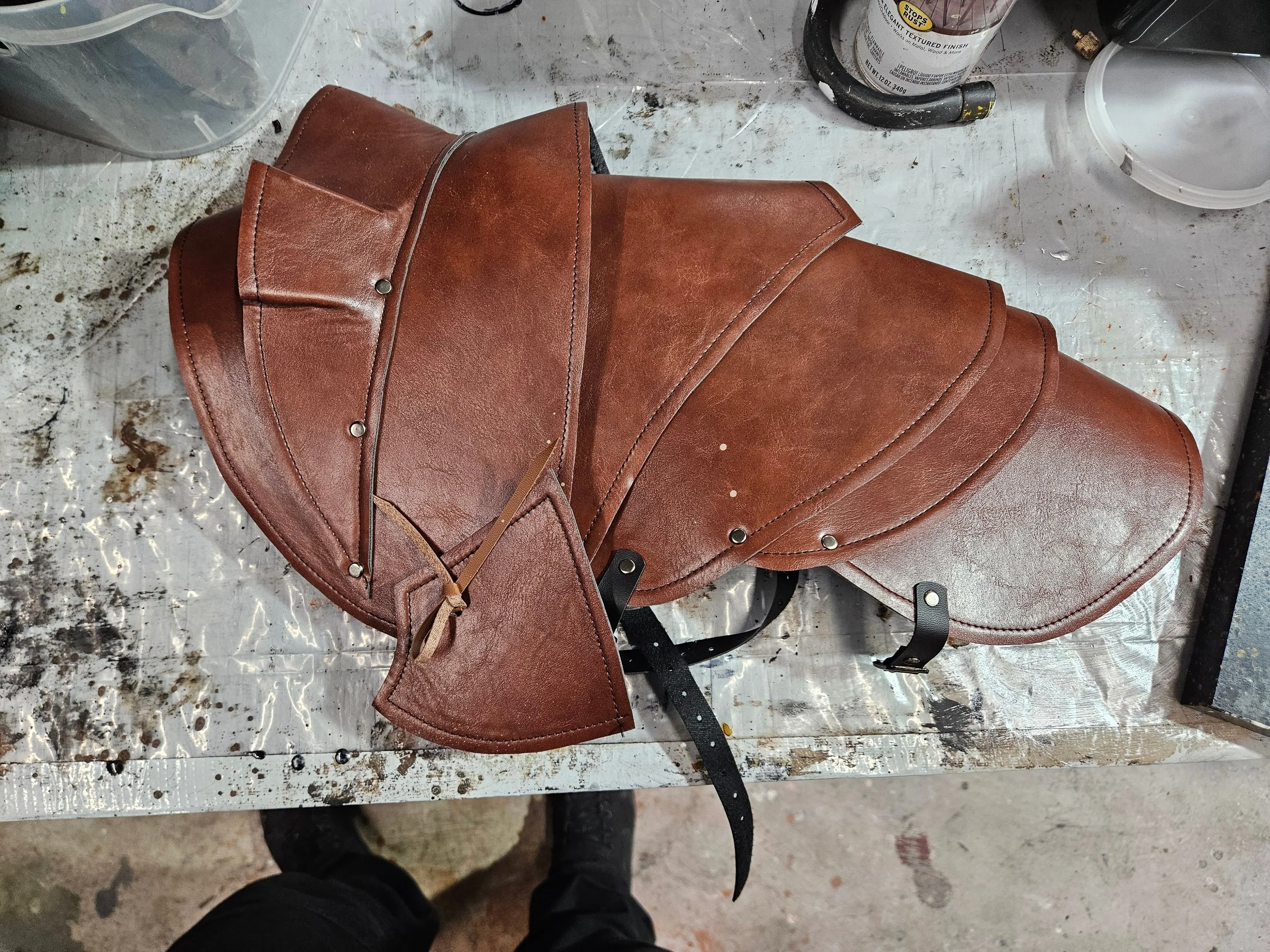 This piece of vinyl armor got a spray, subtractive sponging, and dry-brushing treatment from me. Then I gave it some perma blood and FEV to the metal rivets.