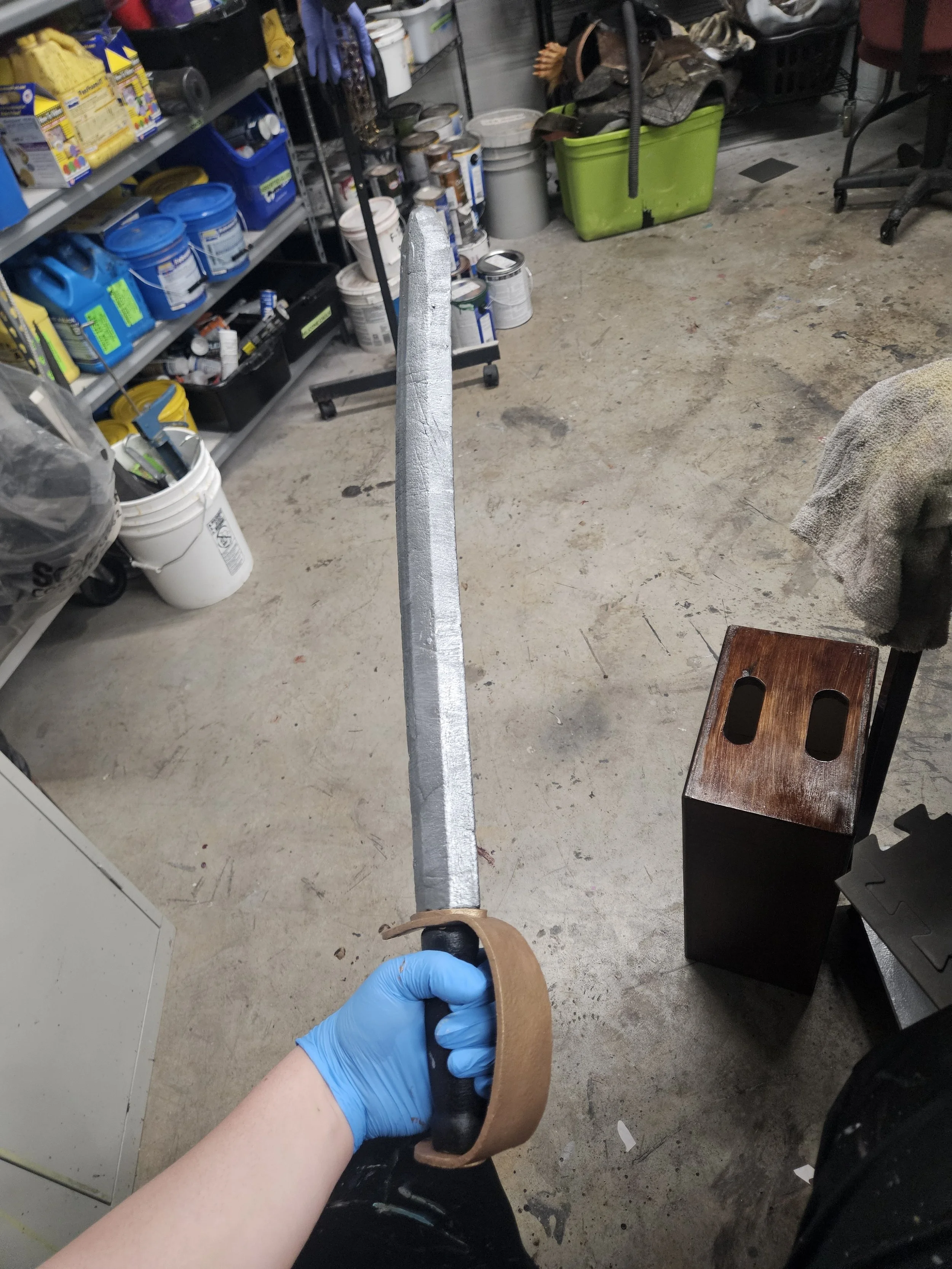 This sword was broken and unsafe to use due to the support bar being exposed. I replaced the broken tip with one I carved from EVA foam to match. Then I gave the sword a new rusty paint job to match the worn shape.