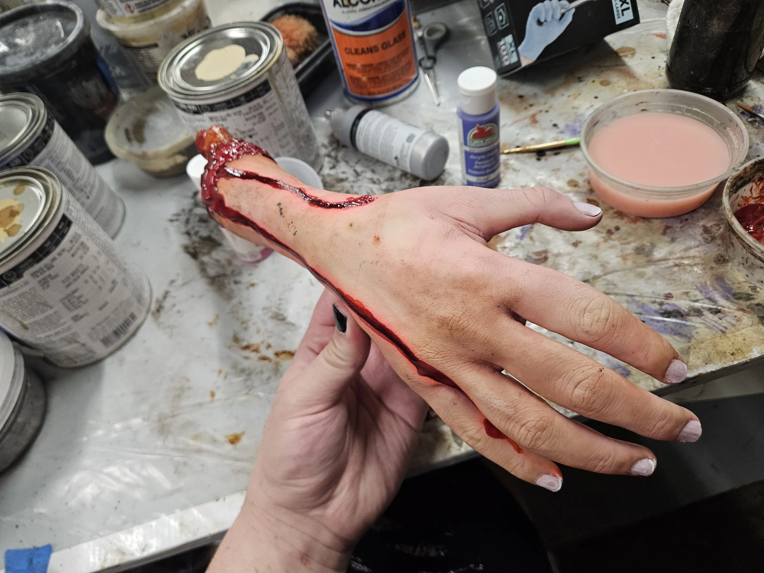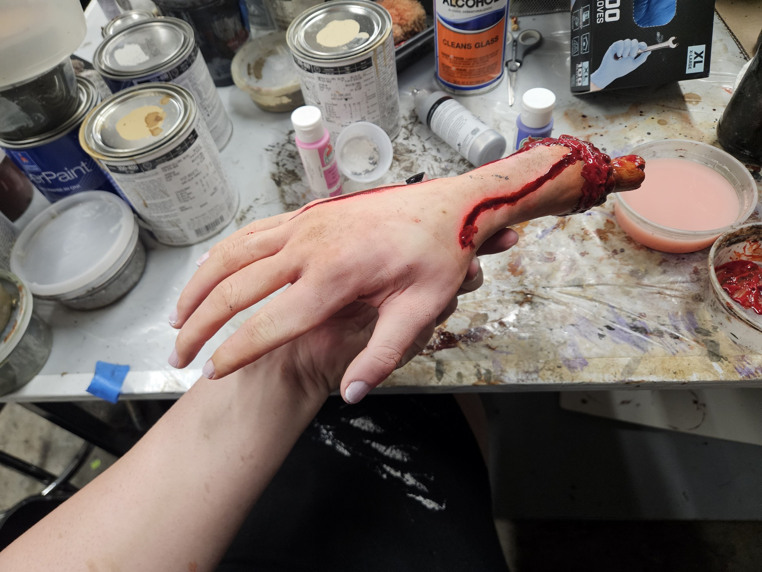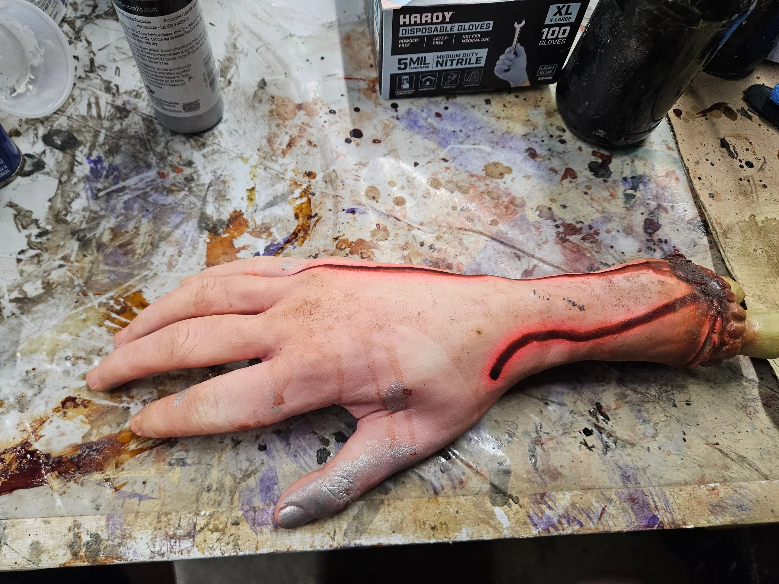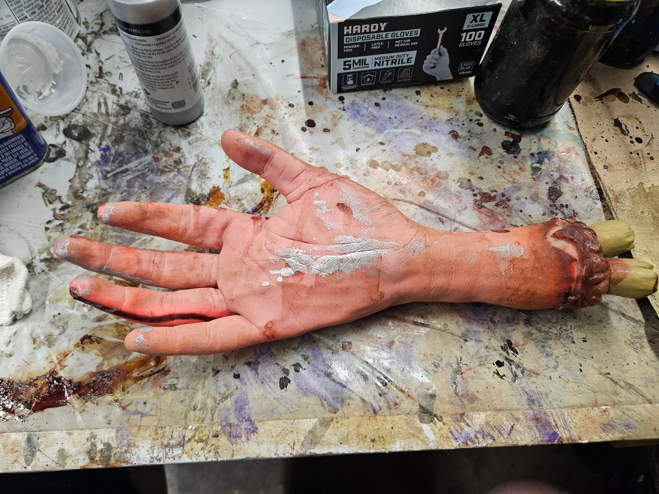 Prop hand repaint. I matched the skin colors of this hand to cover up damages and stains, focused on details such as fingernails, and added perma blood.